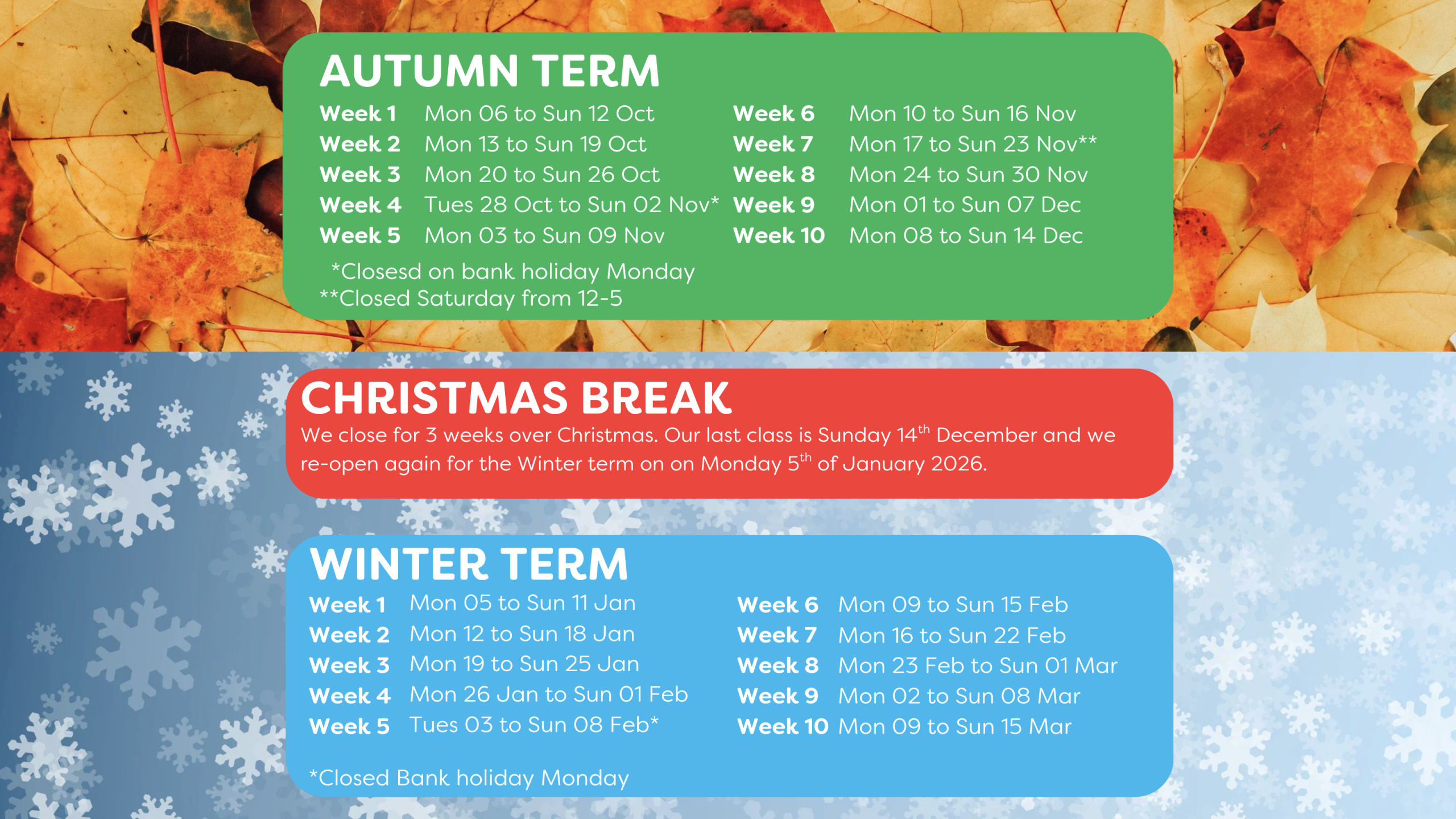 Check out our classes for this current swim term and also for the next upcoming 10 week term. This will also show any bank holidays or other planned closures in that period. For more information on our swim terms please contact us directly and one of our staff will get back to you.