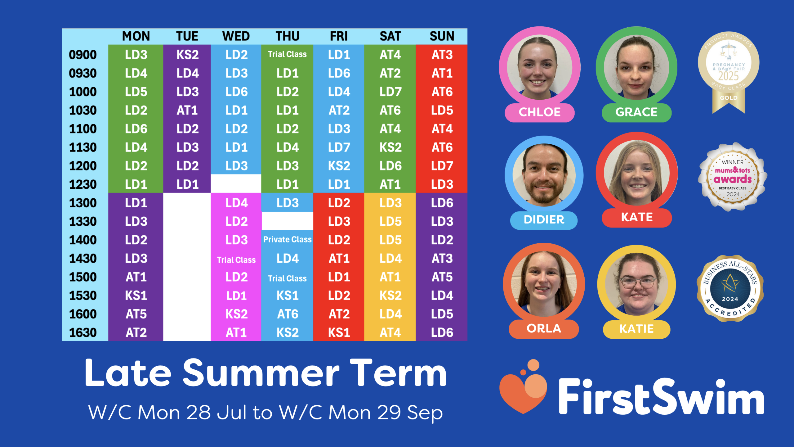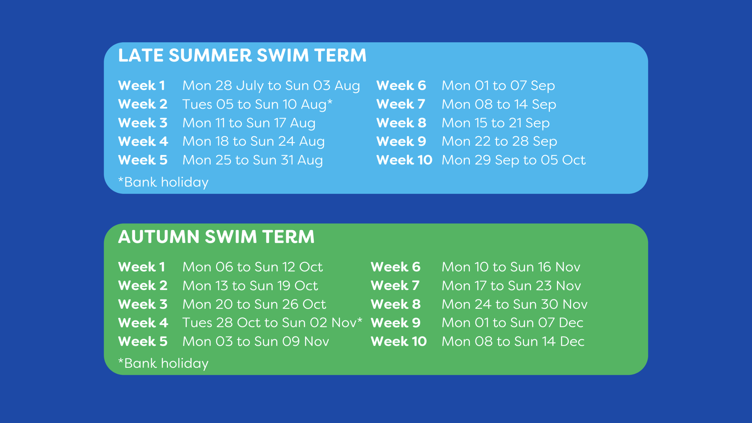Check out our classes for this current swim term and also for the next upcoming 10 week term. This will also show any bank holidays or other planned closures in that period. For more information on our swim terms please contact us directly and one of our staff will get back to you.