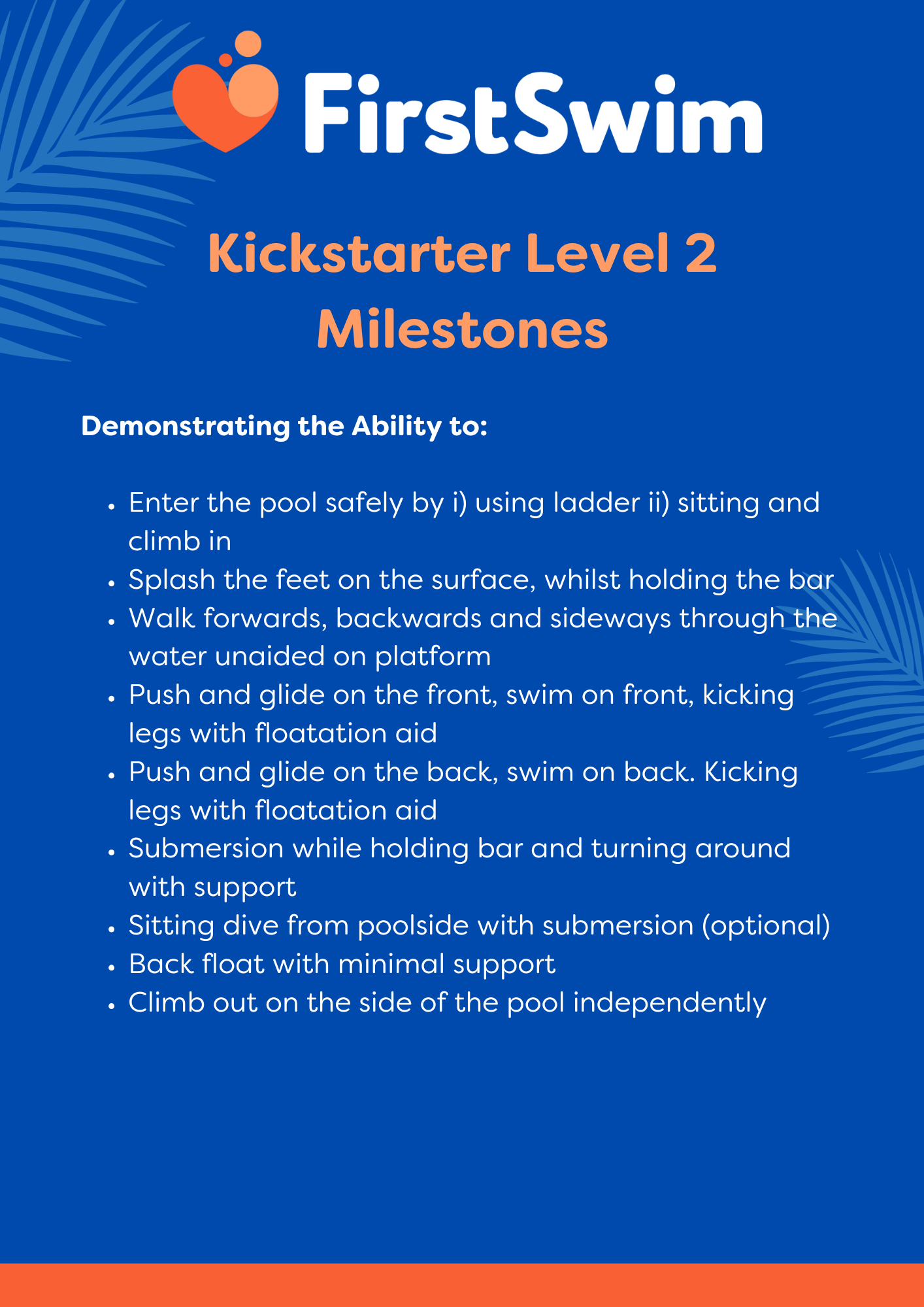 Kickstarter Level 2 is a great platform to develop the skills learned in KS Level 1 and from what you may have done in previous Little Dipper classes. Here we focus on building stamina and fine tuning the motor skills required for swimming. You will really see increased confidence and progress by the end of this level.