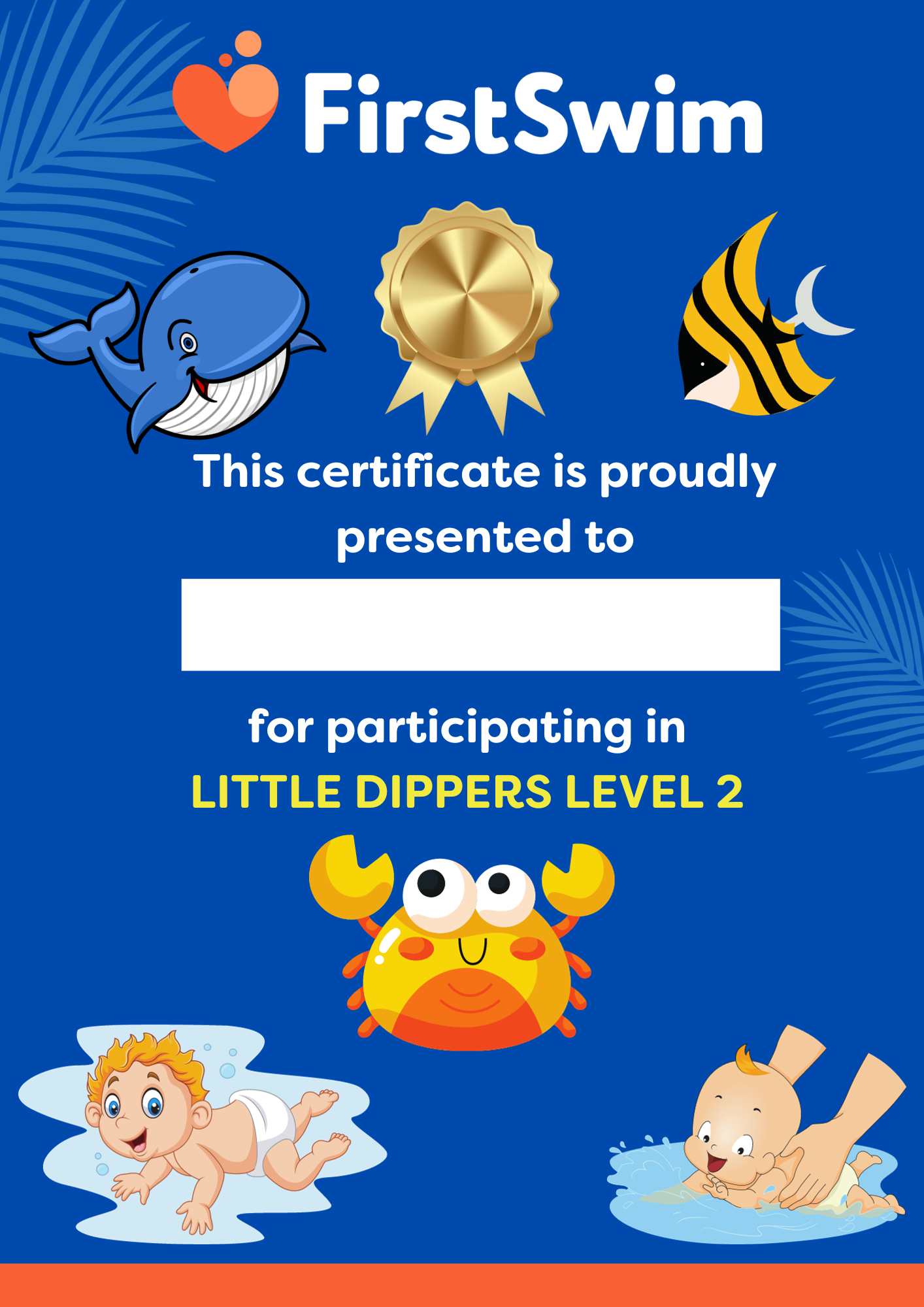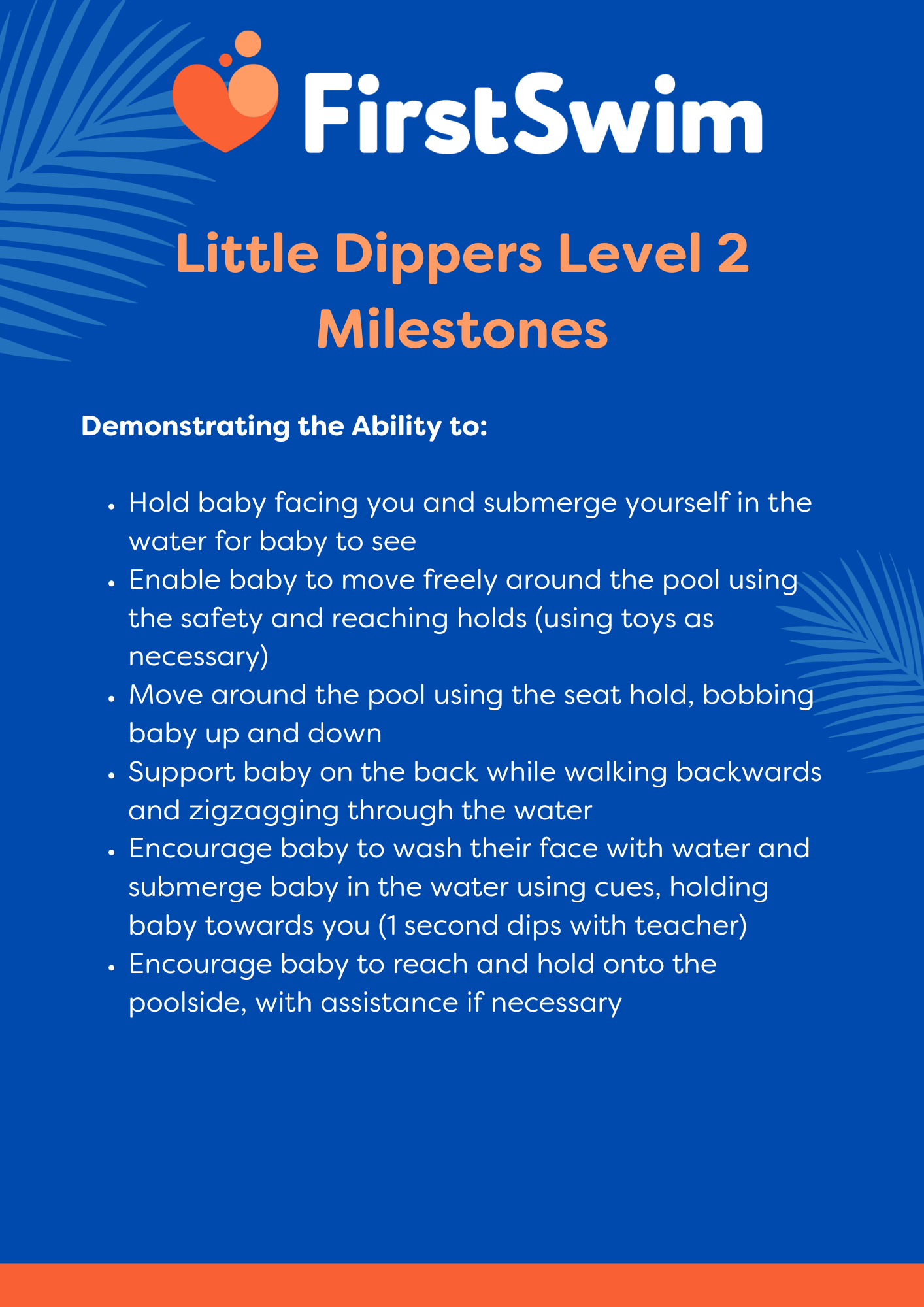Little Dippers Level 2 is for babies who have completed the First Swim Level 1 classes (or equivalent) and for first time swimmers aged 6 months plus. Here you will continue or start your swim journey, building on that age and experience to further develop your babies confidence in the water.