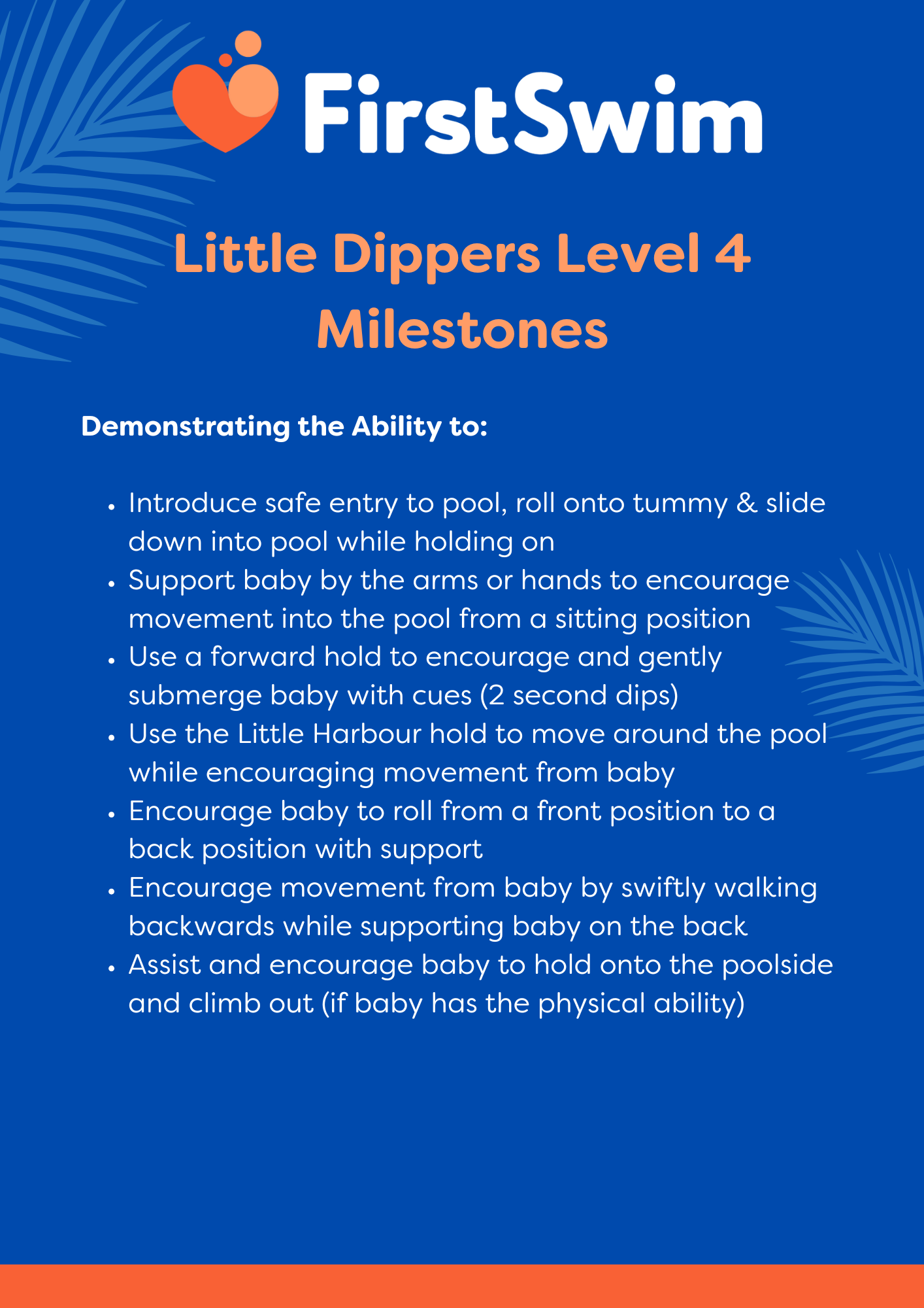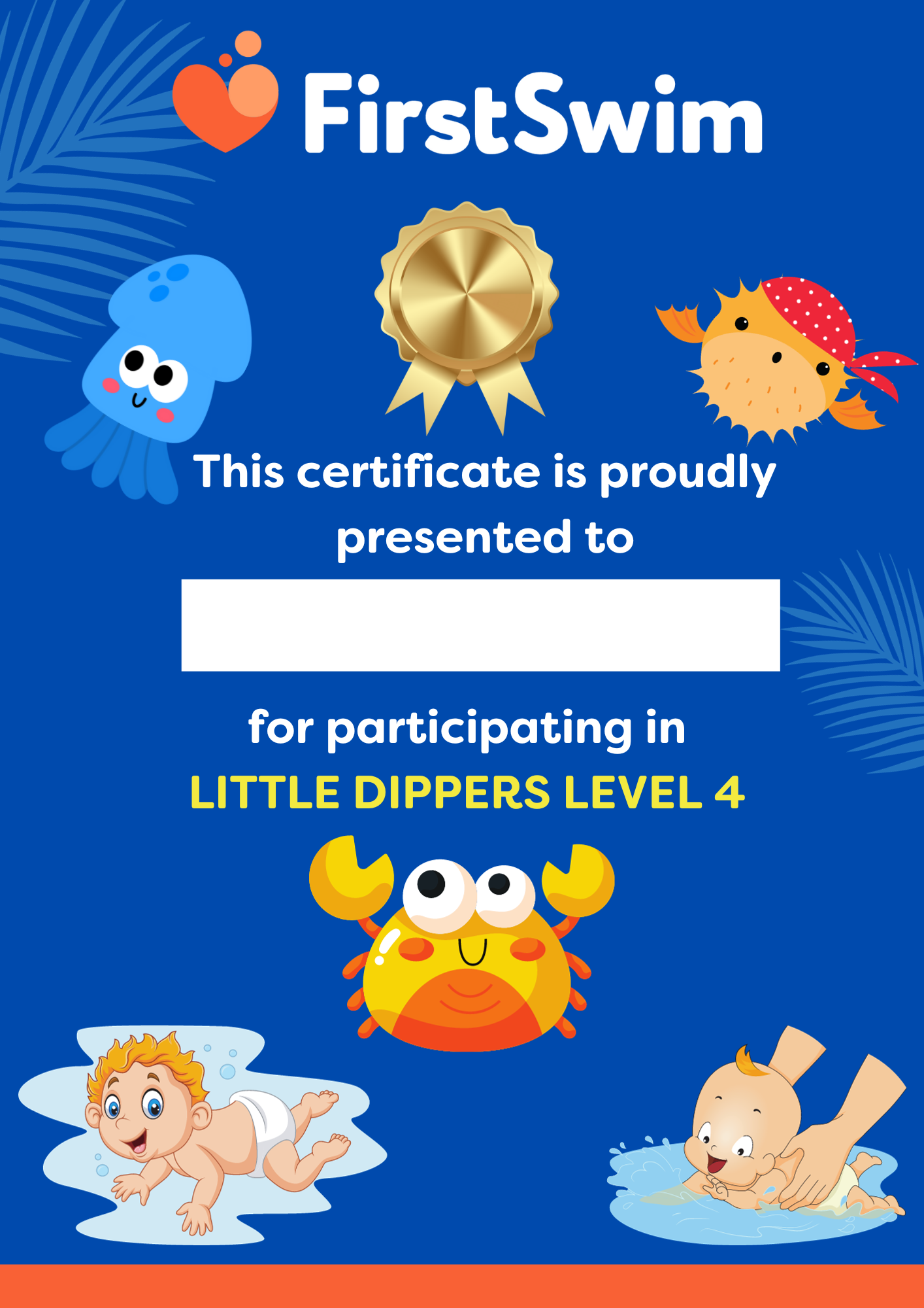 Little Dippers Level 4 is for babies who have completed the First Swim Level 3 classes or had previous equivalent experience. Building on the experience from previous sessions your baby will now look to develop their swim skills with our qualified trainers and encouraged by your reassuring voice commands.