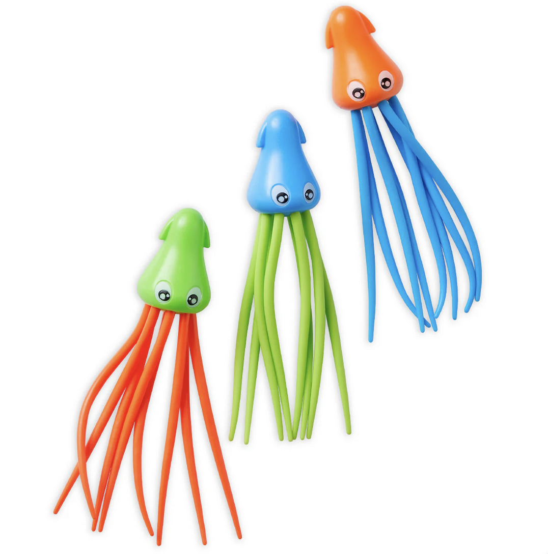 Pack of 3 colourful squid dive toys. Helps improve water confidence and coordination in the water.
